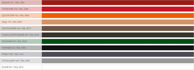 - Колір, підібраний до листової сталі – система "Struga" виготовляється у одинадцяти варіантах кольорів, з яких усі підходять до кольору існуючого дахового скату.