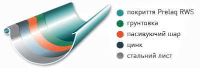 Безумовною перевагою листової сталі Prelaq RWS є товстий шар цинку, до 300г/м2 з двох сторін, який є бронею, що захищає сталеву серцевину від іржи, особливо в місцях надрізів і подряпин. Товщина серцевини в залежності від елементу складає 0,6 – 1,25 мм